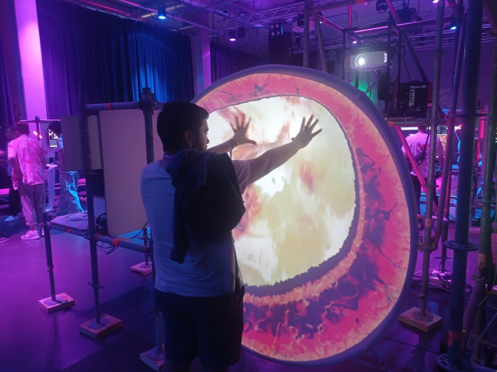 PortalVision is an interactive, audiovisual installation designed and implemented for a self-developed textile interface. By pushing into the projection surface, users break through the fourth wall, dive into the depths of the oceans or discover visions in the flames. A multi-sensory experience.
