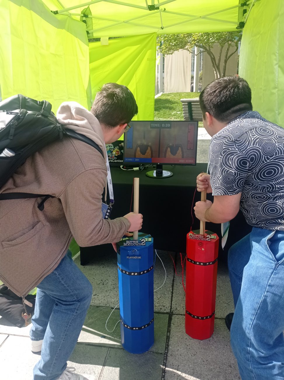 In this rhythm game, two players compete to be the fastest butter churners.