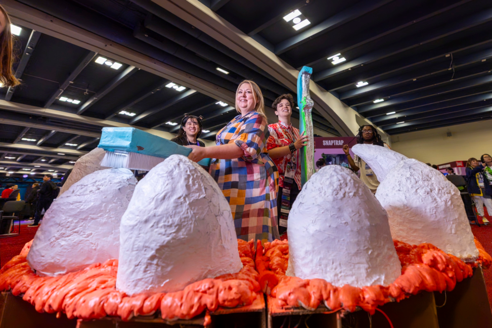 Floss Boss is an interactive alternatively controlled experience where two players brush and floss a set of giant fish teeth, defeating bacteria and racking up as many points as possible.